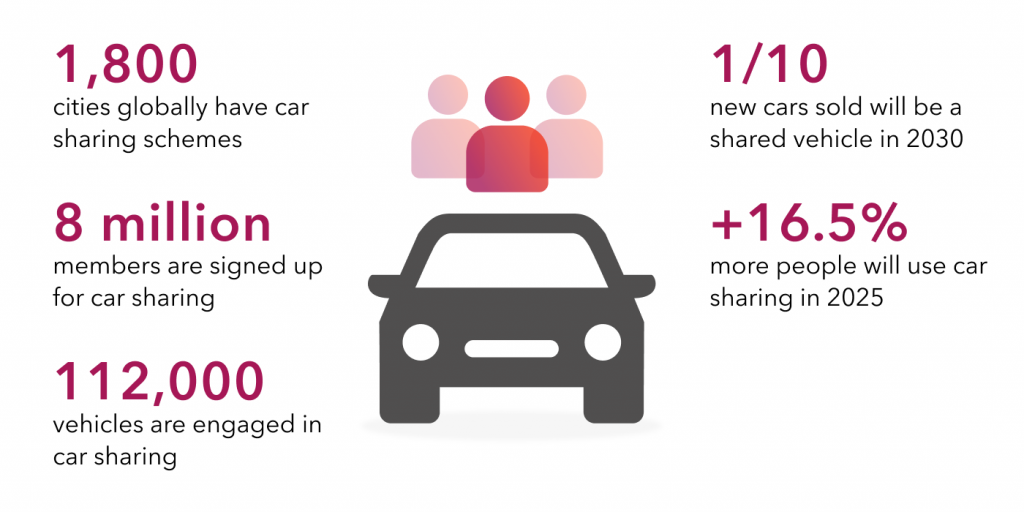 It has been estimated that from 2012 to 2013, the global car sharing market grew by 50% with an approximate of 3.5 million members. It is now expected that by the end of 2020, the number of users will reach 26 million. As per one of the studies, leasing, car sharing, and renting markets are converging whereas car ownership rates are declining. Also, as per the forecasts by Frost and Sullivan, and McKinsey 1/10 new cars will be a shared vehicle in 2030.